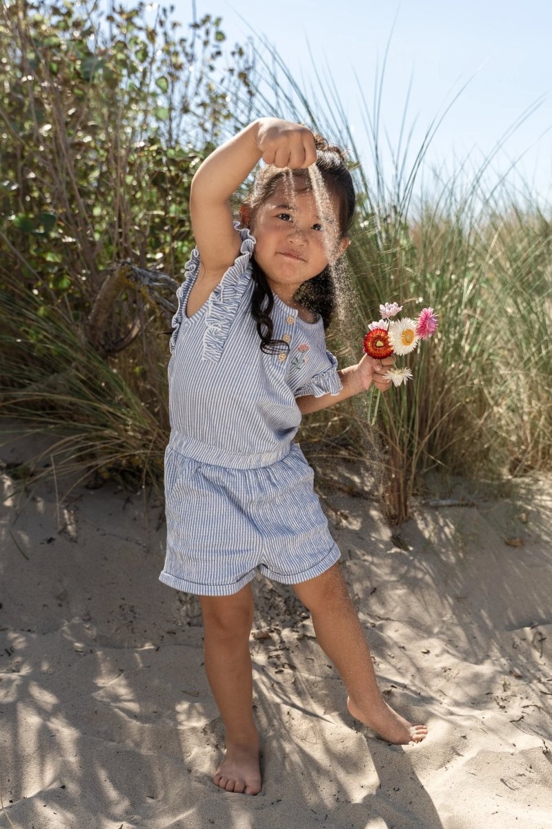Le rouches sulle spalle offrono un accento allegro e dolce. Grazie alla fascia elastica in vita e alla chiusura con bottoni al centro, vestirsi e svestirsi è facile e veloce. Realizzato in cotone biologico e certificato Oeko-Tex, per una scelta sicura e responsabile, ogni giorno. Un outfit completo per giornate piene di giochi, scoperte e piccoli momenti felici.