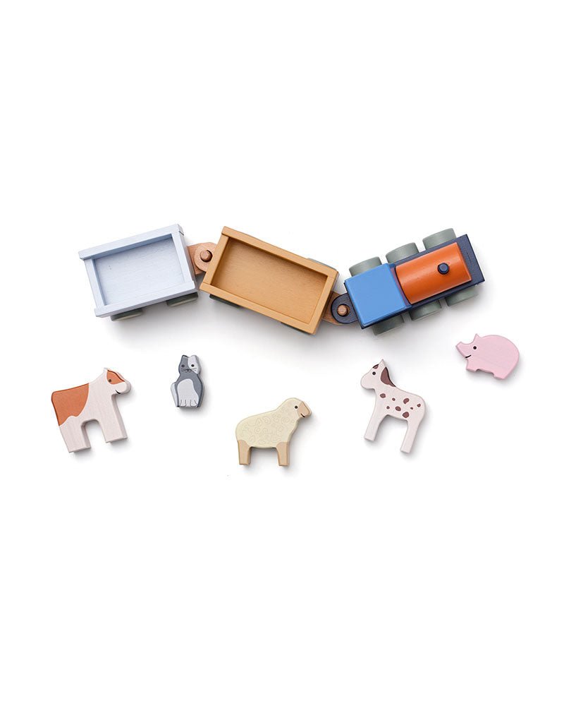 Tutti a bordo del treno della fattoria! Questo incantevole treno di legno è dotato di due vagoni e cinque adorabili animali della fattoria: Mira la mucca, Max il cavallo, Poppy il maiale, Bella la pecora e Sture il gatto. I bambini possono caricare gli animali nei vagoni e inventare le loro storie mentre spingono il treno