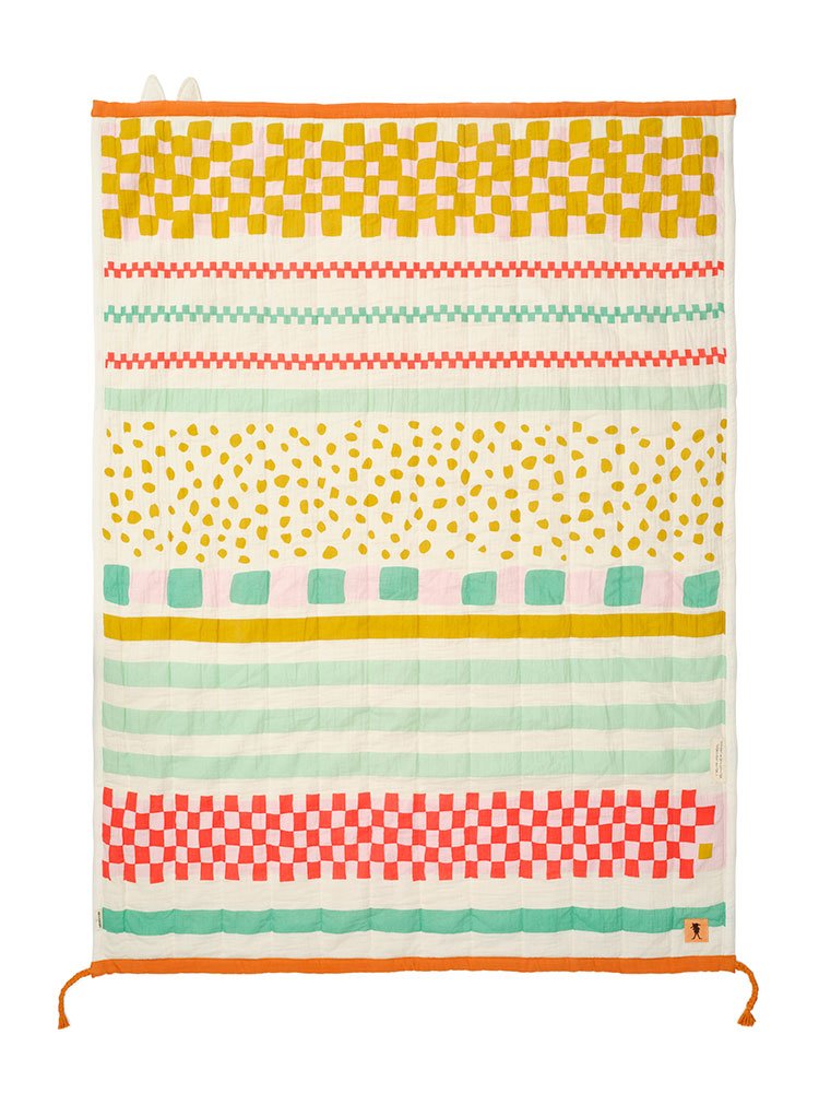 Questa morbida coperta di Pippi Calzelunghe emana lo stesso carattere giocoso. Realizzata con strati di mussola di cotone biologico - un tessuto arioso e traspirante - e imbottita di poliestere riciclato, la coperta offre il calore necessario per i sonnellini, la nanna o un momento di relax sul divano.