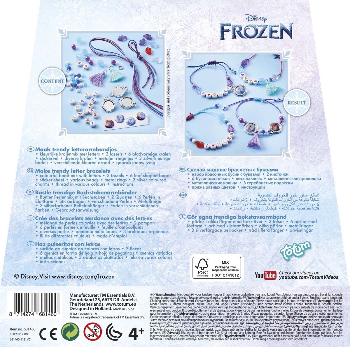 Con questo set completo potrai realizzare i più bei braccialetti Disney Frozen con lettere, ciondoli, nappe e perline, per 4 simpatici braccialetti