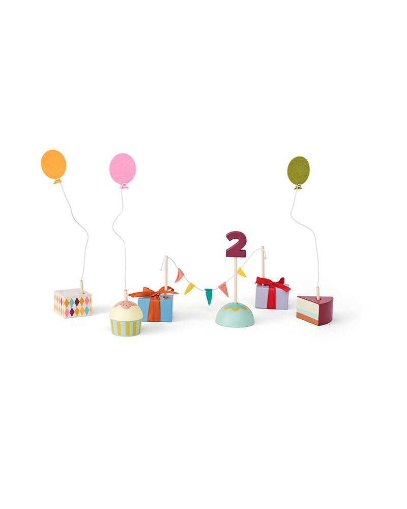 Il set è composto da cinque decorazioni a forma di regali, torte e cupcake. In ogni oggetto è possibile inserire un numero in legno per indicare l'età del festeggiato. I numeri inclusi da 0 a 9, più un 1 extra, consentono di riutilizzare il set anno dopo anno.