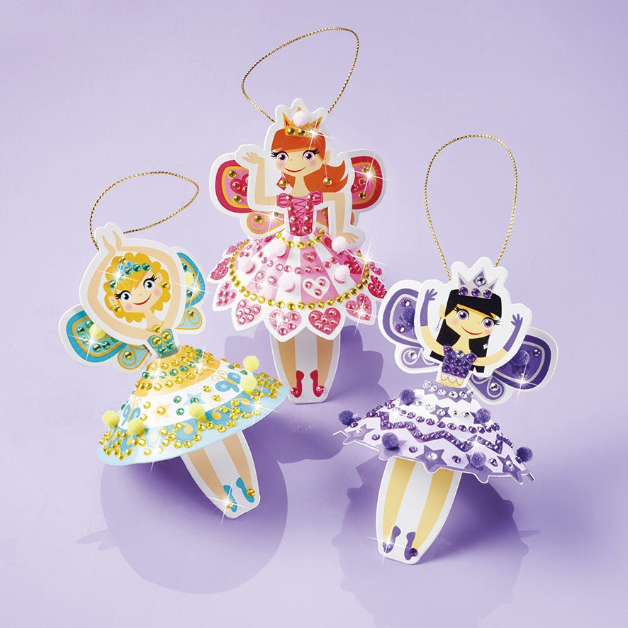 Prima decora le fate stesse con gli strass e poi completa i loro abiti decorando anche le gonne delle fate con strass e pom pom.