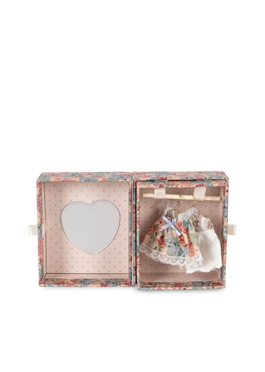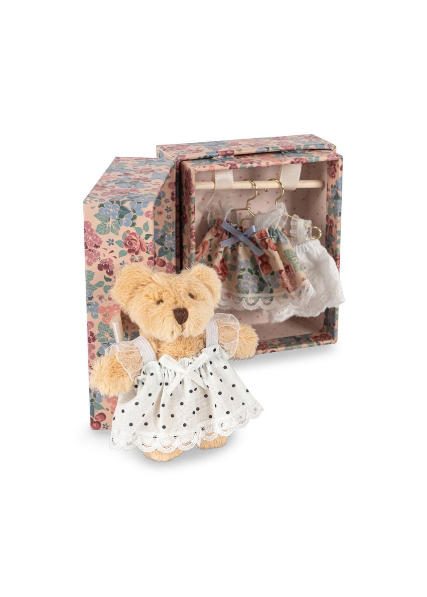 Il set comprende un orsetto, un mini armadio con uno specchio a forma di cuore e tre diversi vestiti da indossare. Perfetto per giochi di ruolo fantasiosi e travestimenti creativi
