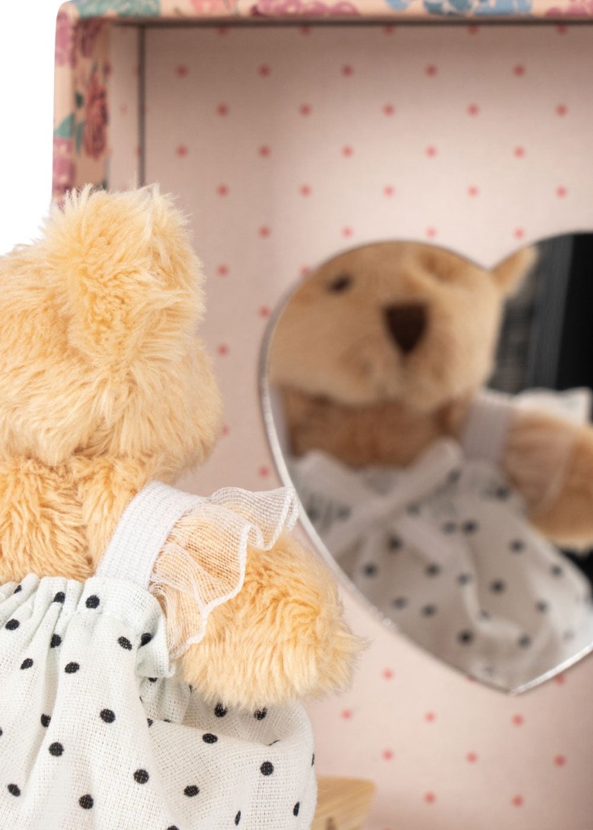 Ti presentiamo il nostro Tiny Teddy, che adora vestirsi! Ogni giorno gira allegramente davanti al suo specchio a forma di cuore con i suoi simpatici vestitini e inventa nuovi e divertenti abiti. Tiny Teddy vive e dorme nella sua piccola credenza: apri con attenzione la porta e sarà pronta per un'altra giornata di divertimento.