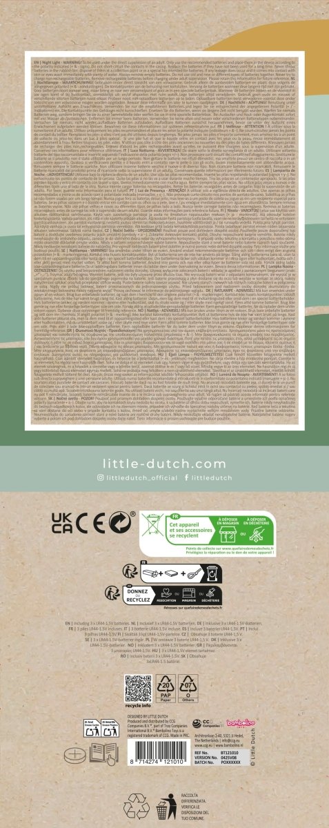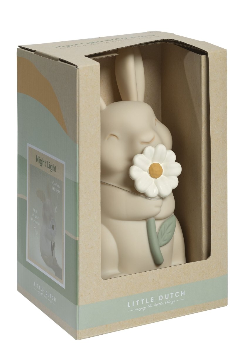 Incontra il simpatico coniglio Little Dutch ! La luce notturna diffonde una luce soffusa nella stanza dei bambini. La luce si accende e si spegne facilmente grazie all'interruttore posto sul fondo della lampada e si spegne automaticamente dopo 12 minuti per risparmiare le batterie. Questa luce notturna funziona con 3 batterie a bottone LR44 (incluse).