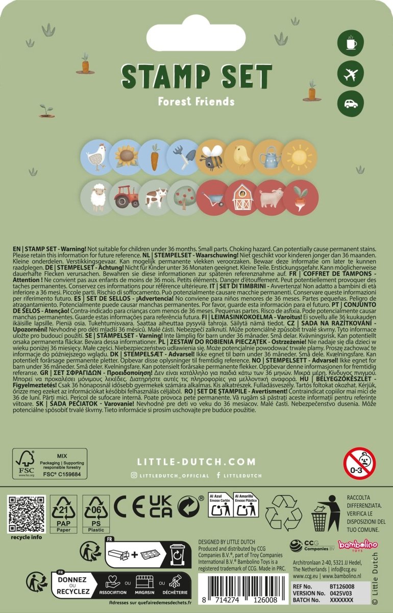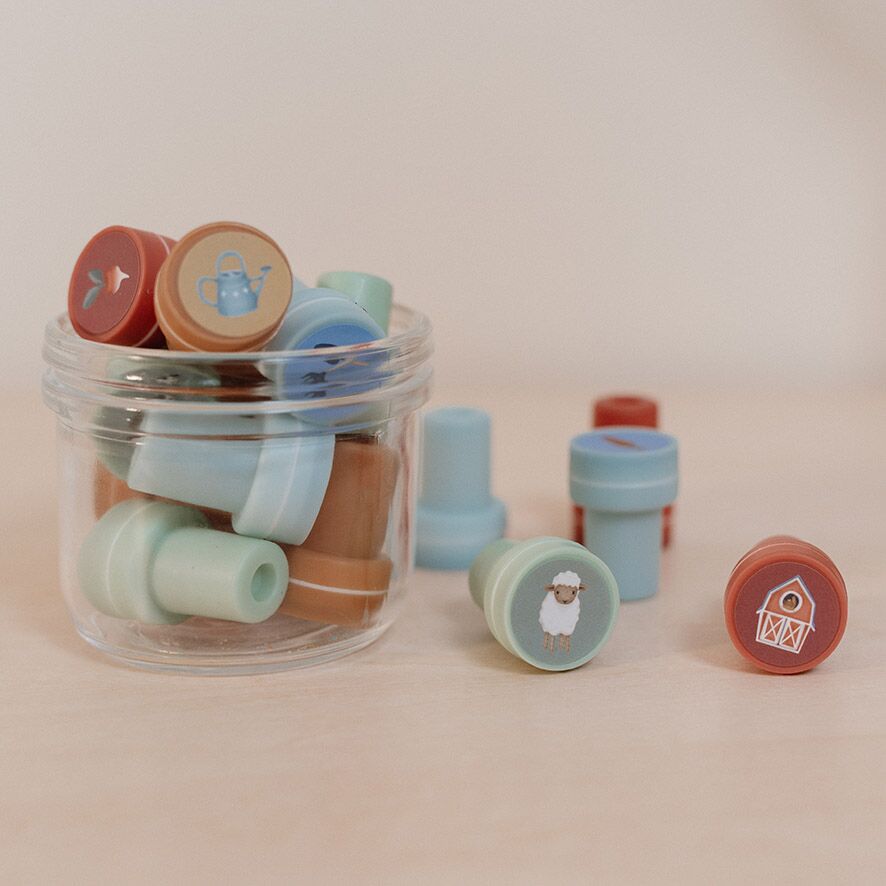 Dai vita alla fattoria con i timbri autoinchiostranti Little Farm di Little Dutch! Questo set contiene diversi timbri con immagini di simpatici animali della fattoria come mucche, pecore e galline. Con questi timbri, i bambini potranno creare le loro avventure nella fattoria su carta o su pagine da colorare. I timbri sono autoinchiostranti, quindi non serve altro inchiostro. Un modo semplice e divertente per stimolare la creatività e sviluppare la motricità fine. Il set include anche una pratica scatola per riporre i timbri.
