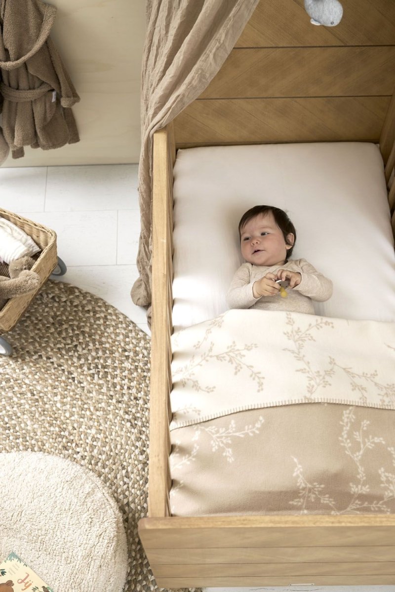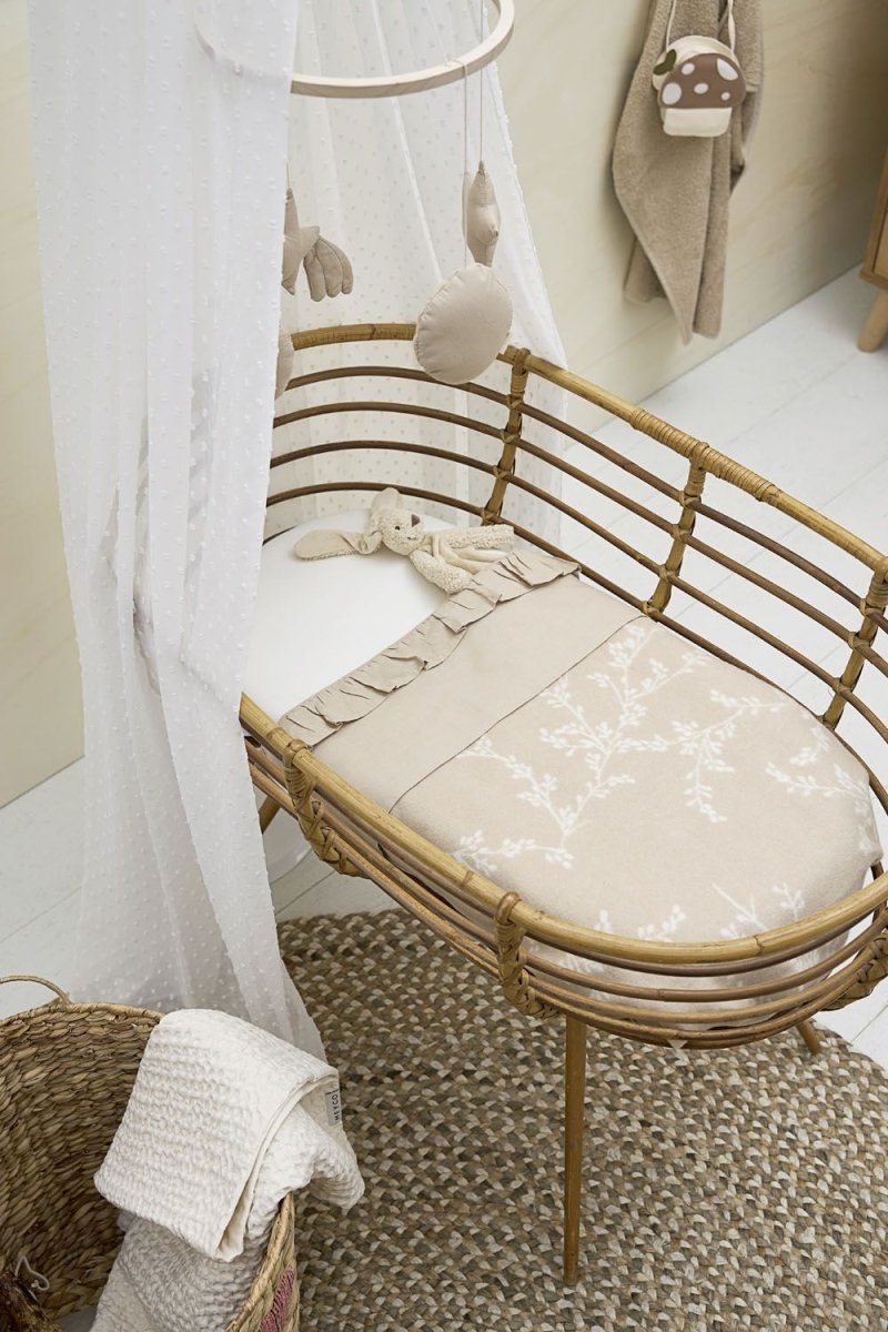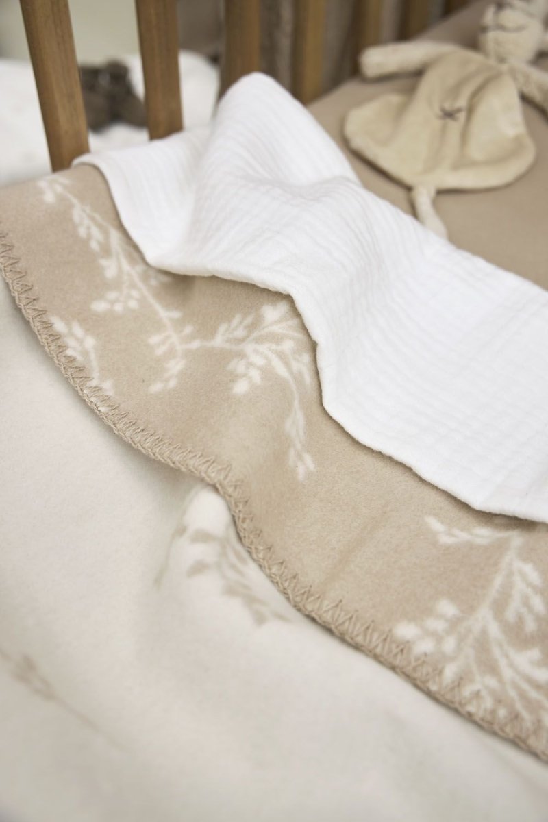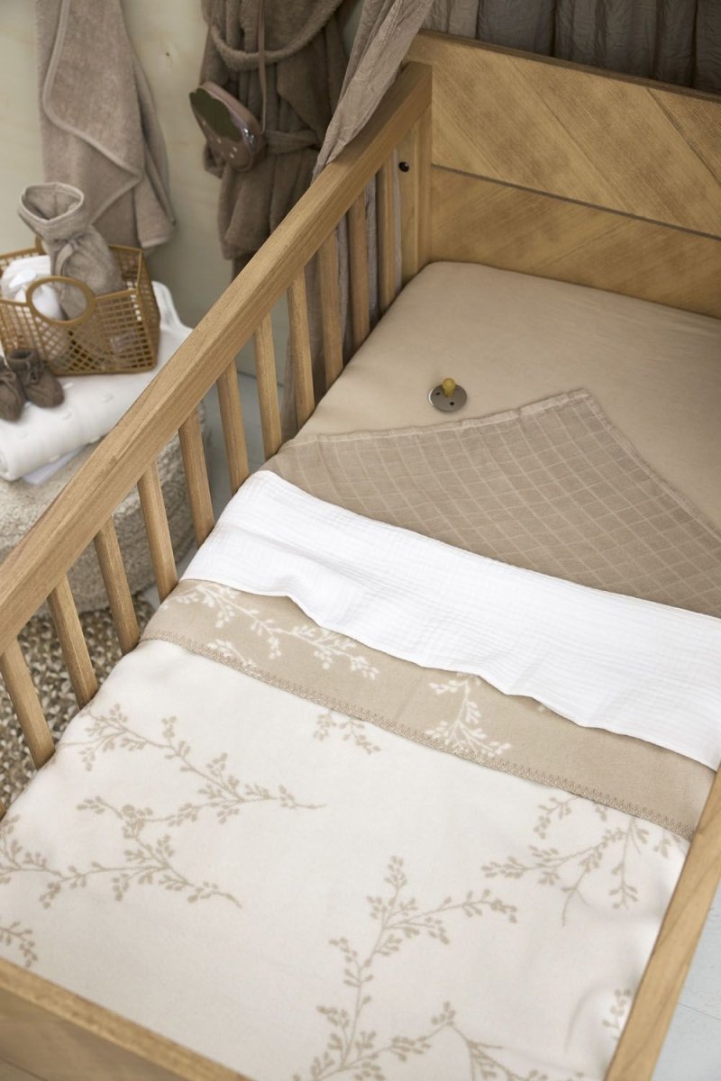 Il tuo piccolo dormiglione godrà di un enorme comfort e calore con questa coperta Meyco Baby Branches. La stampa di rametti naturali e tranquilli con uno sfondo color sabbia si abbina facilmente al resto della stanza del bambino. Questa coperta ha l'incredibile capacità di essere utilizzata in due modi. Un lato ha uno sfondo caldo e color sabbia con un sottile motivo di ramoscelli bianchi. Capovolgendo la coperta, otterrai un nuovo sfondo bianco con lo stesso motivo giocoso. Così potrai variare facilmente e la coperta si abbinerà a qualsiasi arredamento. Usa la coperta su un lenzuolo Meyco per bambini per creare il lettino.