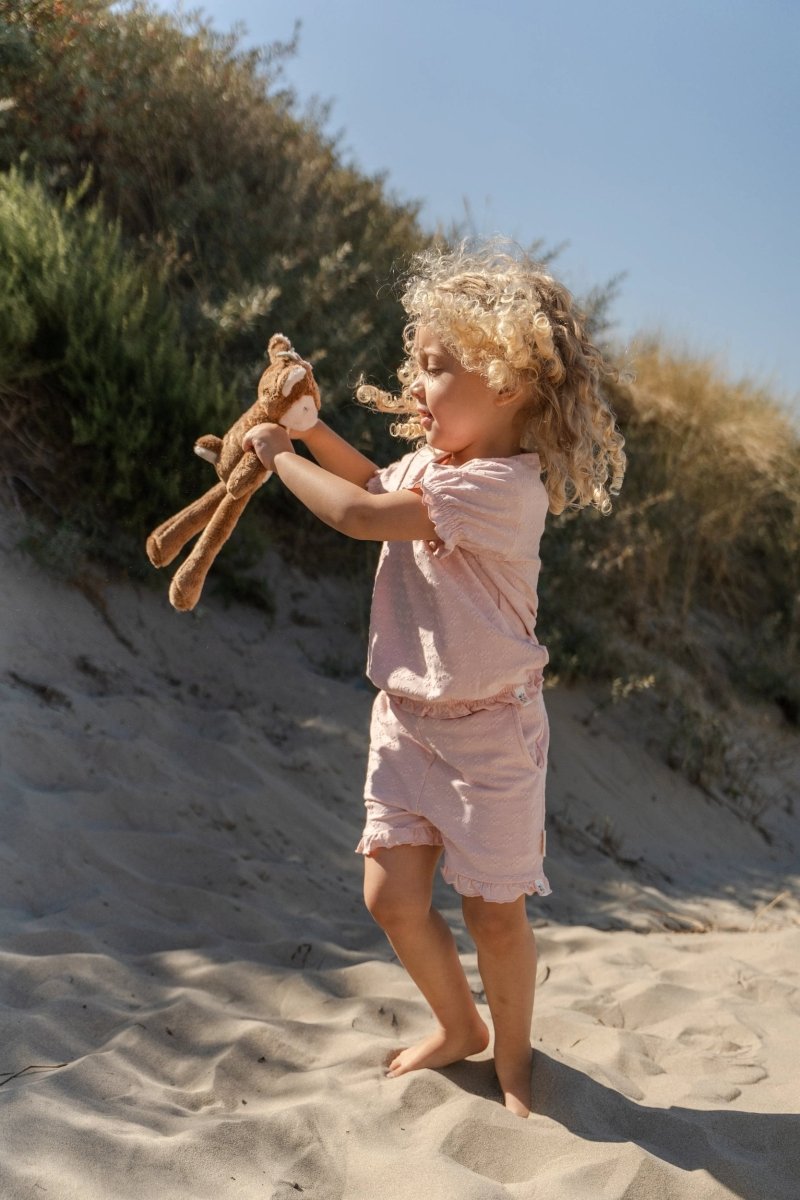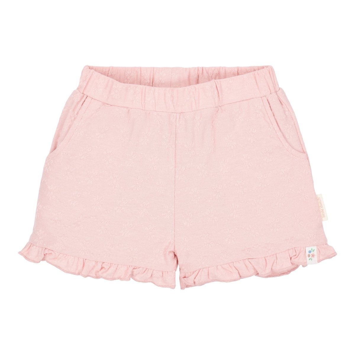 Morbidi, leggeri e deliziosamente giocosi. Questi pantaloncini in Fairy Pink sono realizzati in un tessuto elasticizzato con un sottile rilievo floreale, perfetto per le giornate calde e piene di movimento e divertimento.