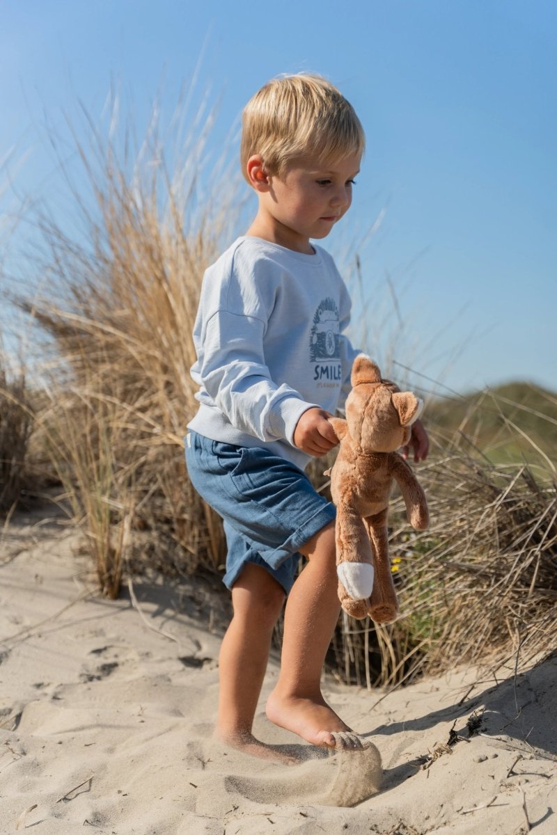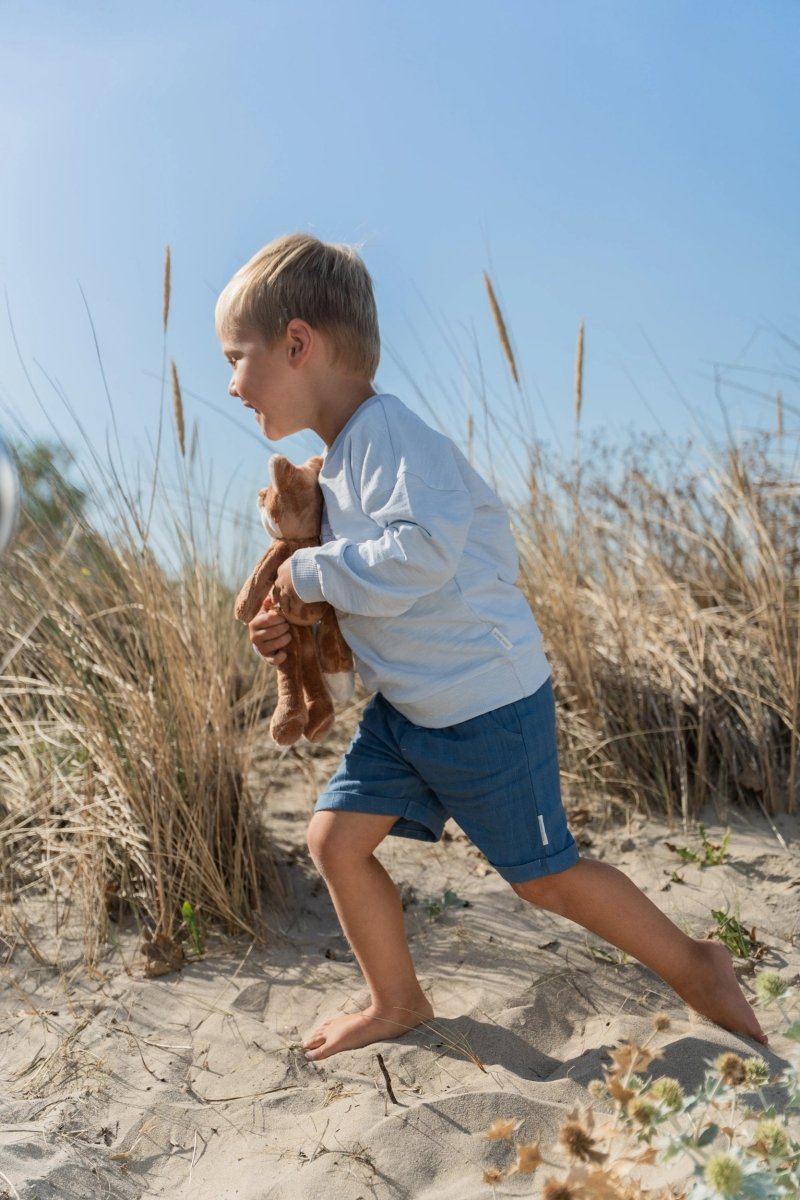 Brillanti, freschi e perfetti per le giornate di sole: questi pantaloncini in Indigo sono realizzati in un comodo tessuto effetto lino con sottili dettagli a righe. L'elastico in vita con coulisse assicura una vestibilità aderente, mentre i risvolti sulle gambe e le tasche laterali aggiungono un tocco giocoso. Realizzati in 55% viscosa e 45% cotone biologico, certificati Oeko-Tex, i pantaloni sono morbidi e traspiranti.