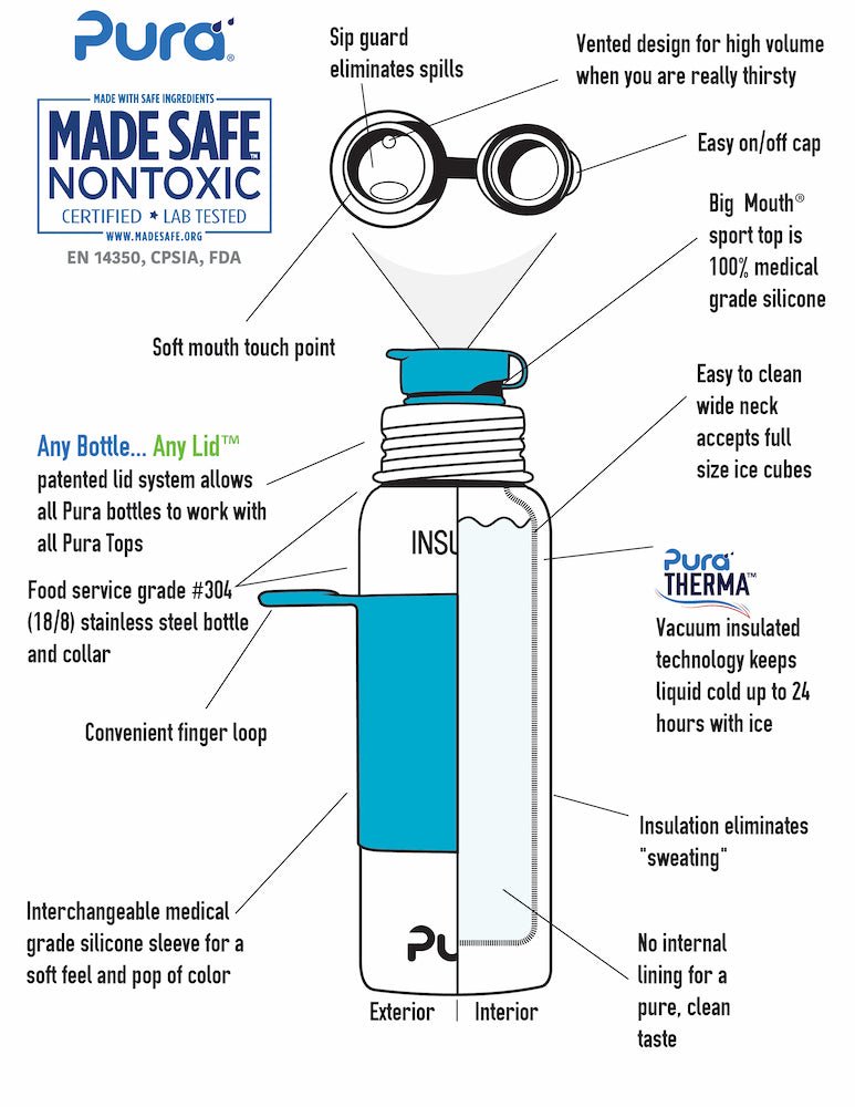 Il thermos in acciaio inossidabile Pura è l'unica bottiglia con beccuccio al 100% priva di plastica al mondo e certificata MadeSafe®. Realizzata in acciaio inossidabile e silicone medicale di alta qualità, è priva di BPA, BPS, PVC, ftalati e piombo. Questo biberon pluripremiato è quindi completamente sicuro per te, la tua famiglia e l'ambiente