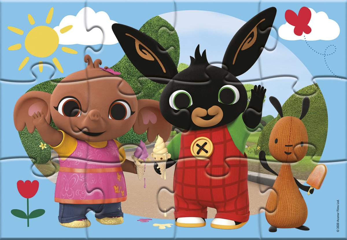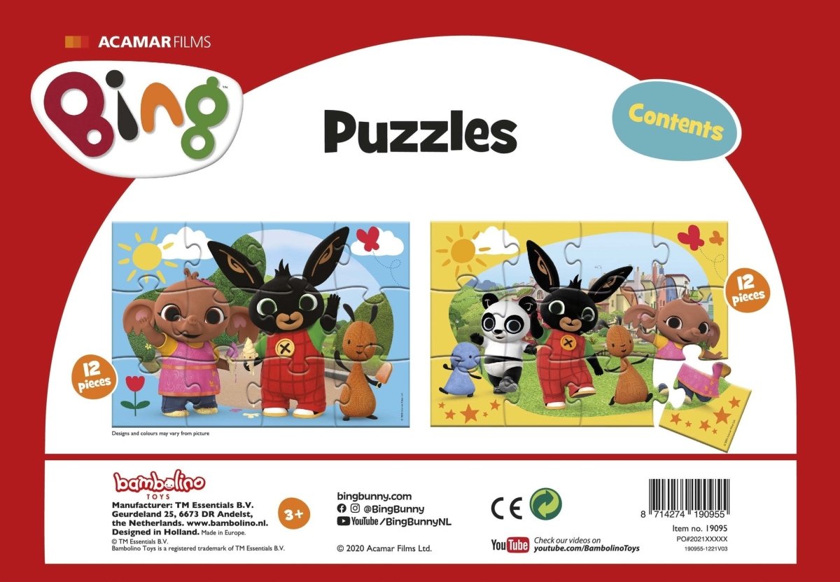 Questo set è composto da 2 puzzle da 12 pezzi ciascuno con un'immagine colorata di Bing e dei suoi allegri amici Sula, Panda e il tenero Flor. Il puzzle è una delle prime attività con cui un bambino allena le abilità motorie e ne scopre di nuove