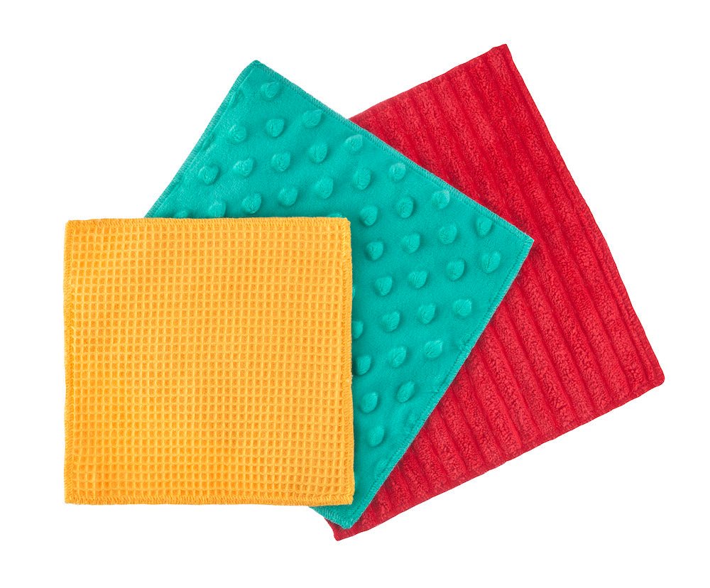 3 salviette di stoffa, una delle quali ha una carta stropicciata e diverse consistenze per sviluppare il senso del tatto