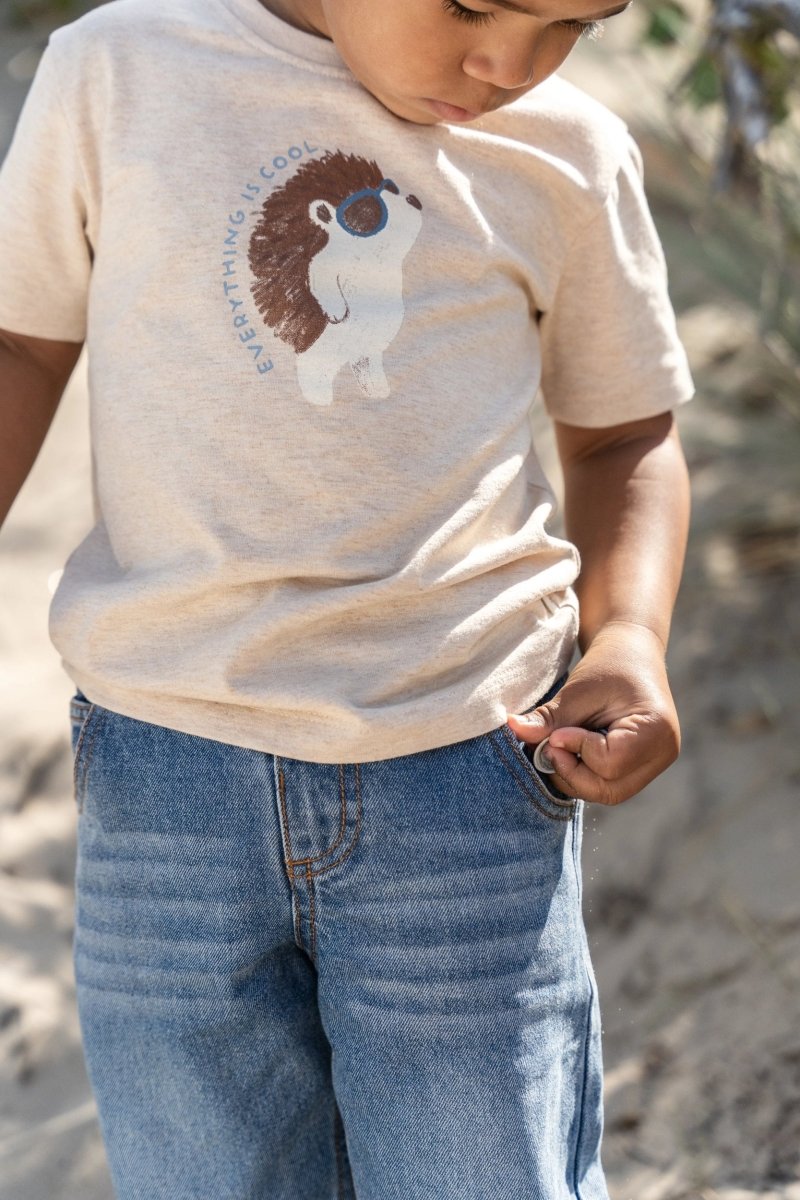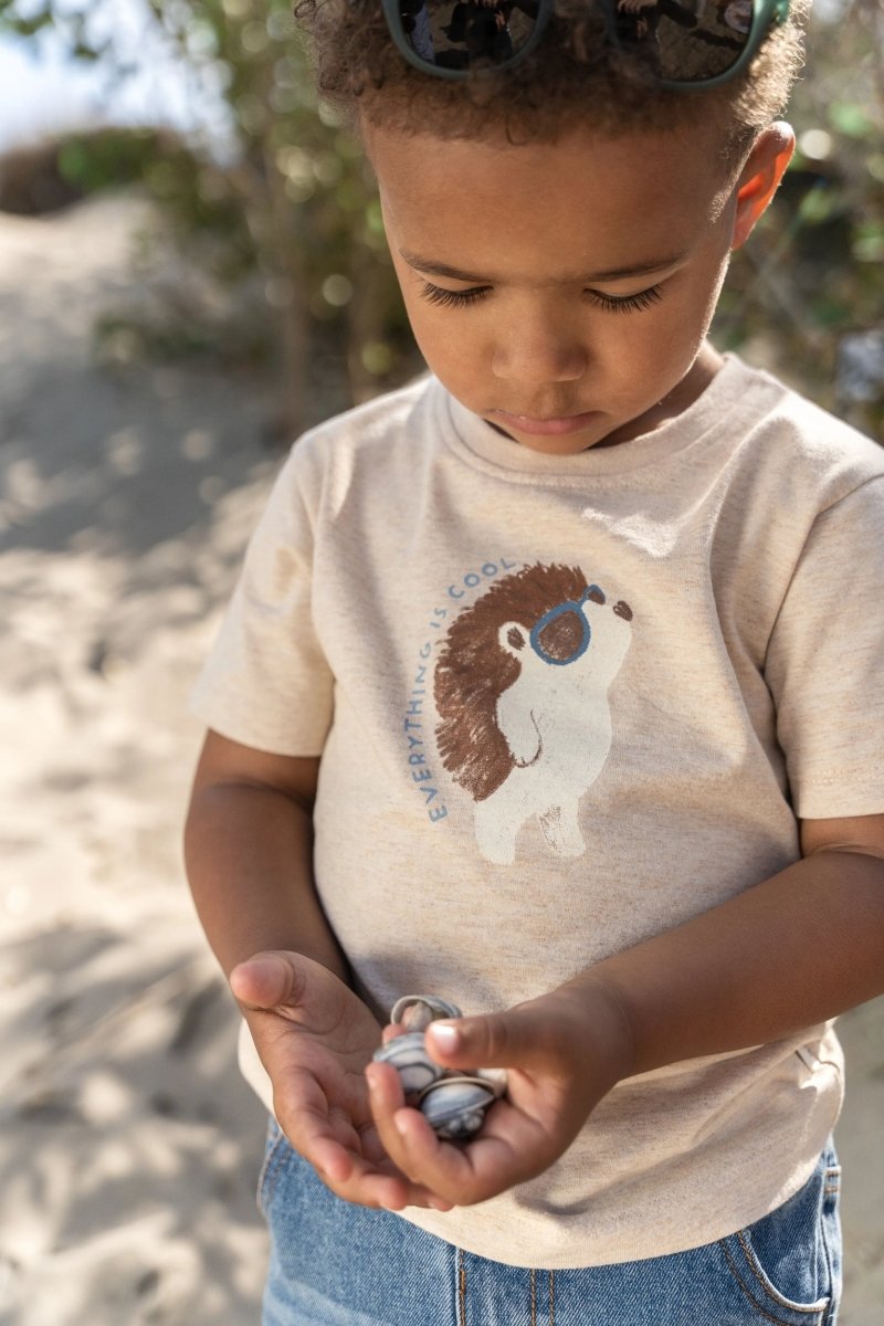 Questa maglietta in biscotto melange combina un tocco di estrosità con un delizioso comfort. Il colore sabbia misto è perfetto per le giornate calde, mentre l'allegro amico della foresta sul petto con gli occhiali da sole offre un tocco giocoso e avventuroso. Realizzata al 97% in cotone organico e al 3% in elastan, con certificazione Oeko-Tex, la maglietta è morbida sulla pelle e rappresenta una scelta consapevole. I bottoni a pressione sulle spalle rendono la vestizione e la svestizione molto semplice.