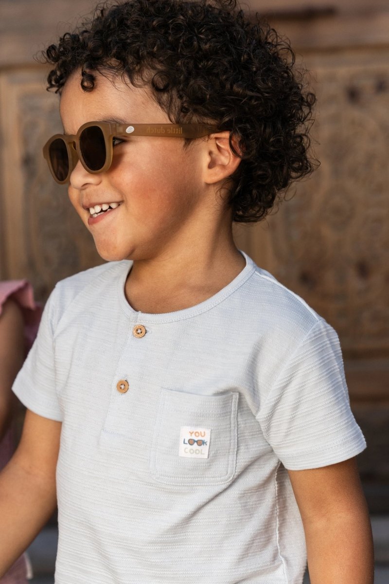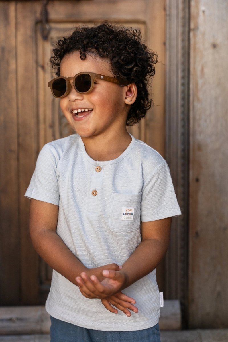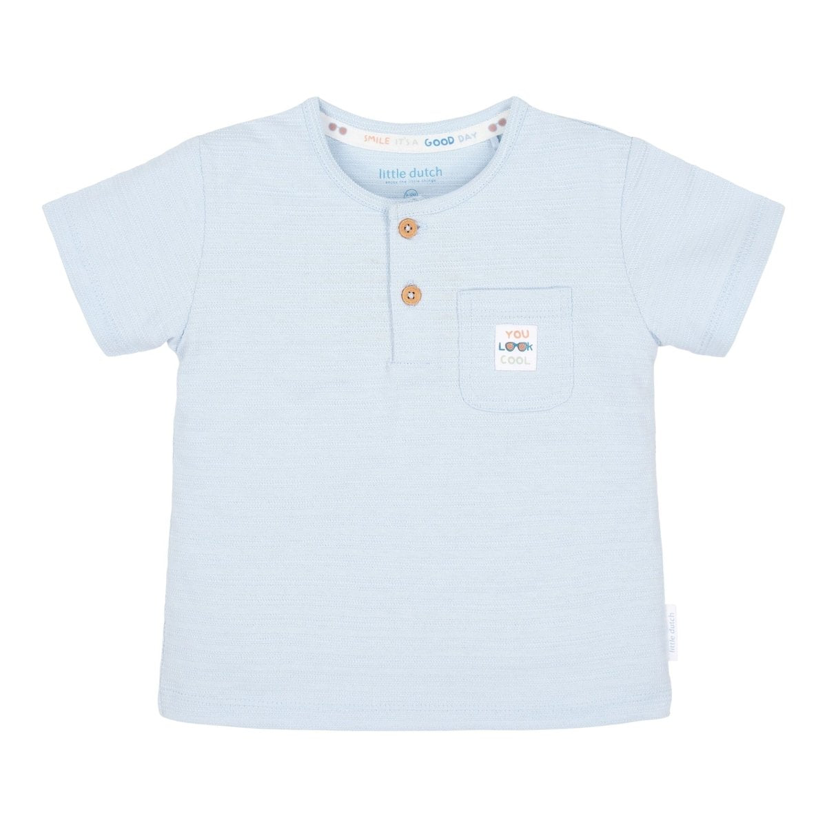 Questa T-shirt blu chiaro è un mix perfetto di comfort e stile. Le sottili strisce in rilievo del tessuto le conferiscono un aspetto vivace, mentre i bottoni in legno e la tasca sul petto con etichetta stampata aggiungono un tocco fresco e giocoso. Realizzata in 100% cotone organico e certificata Oeko-Tex, è morbida sulla pelle ma abbastanza resistente per affrontare qualsiasi avventura. Ideale per le giornate estive all'insegna del movimento, della scoperta e del divertimento.
