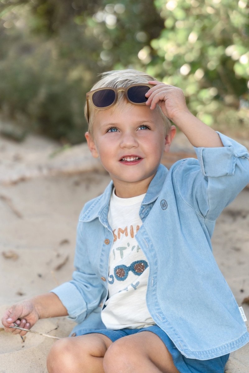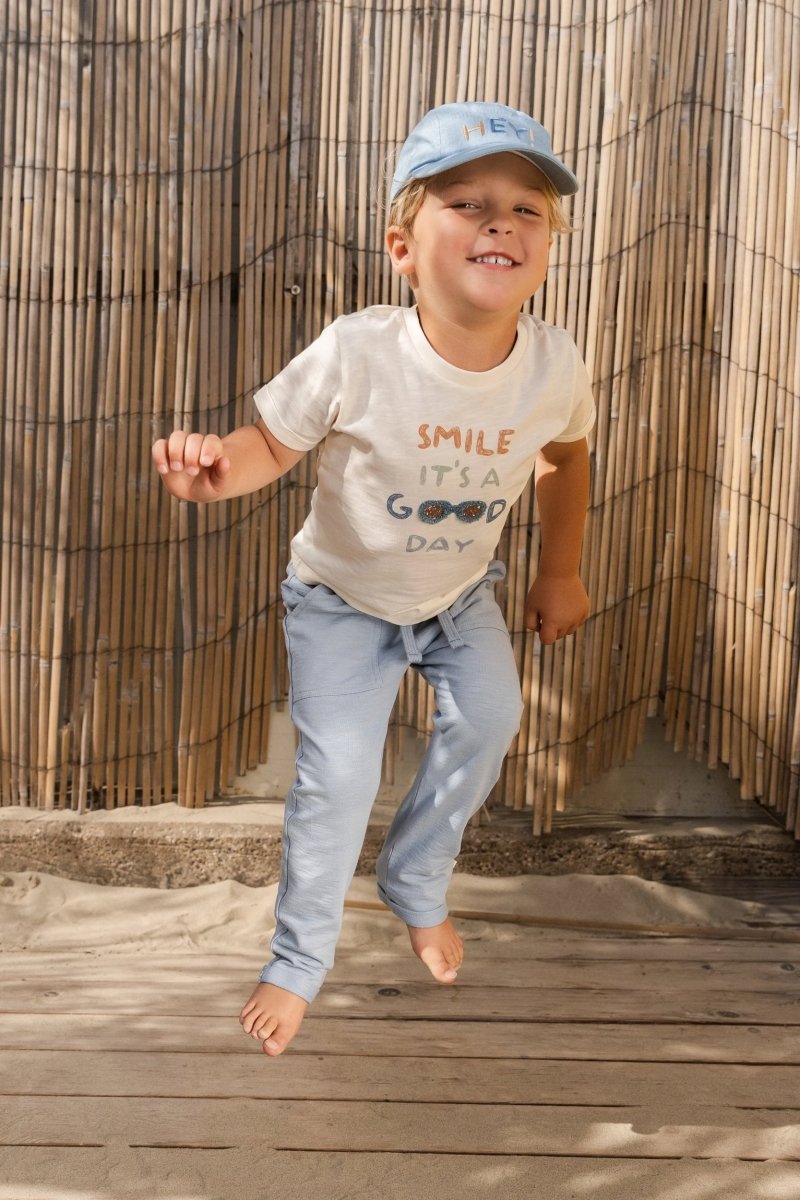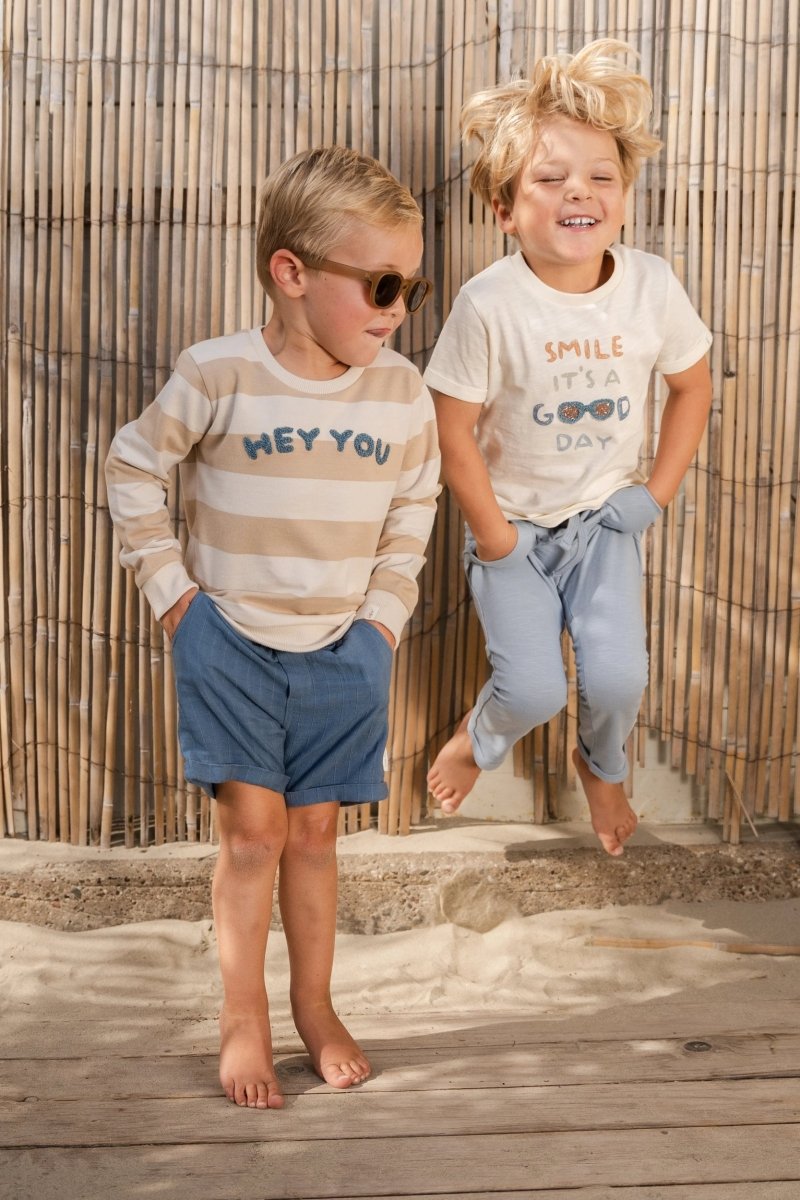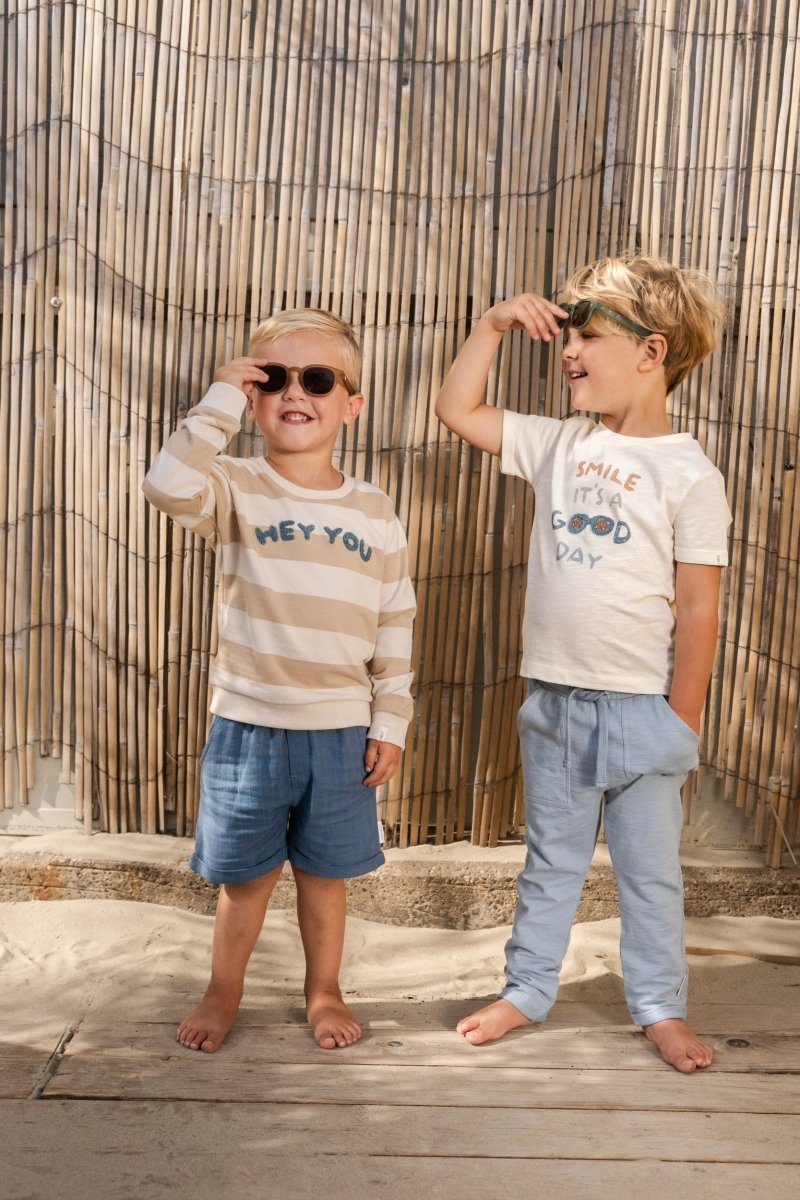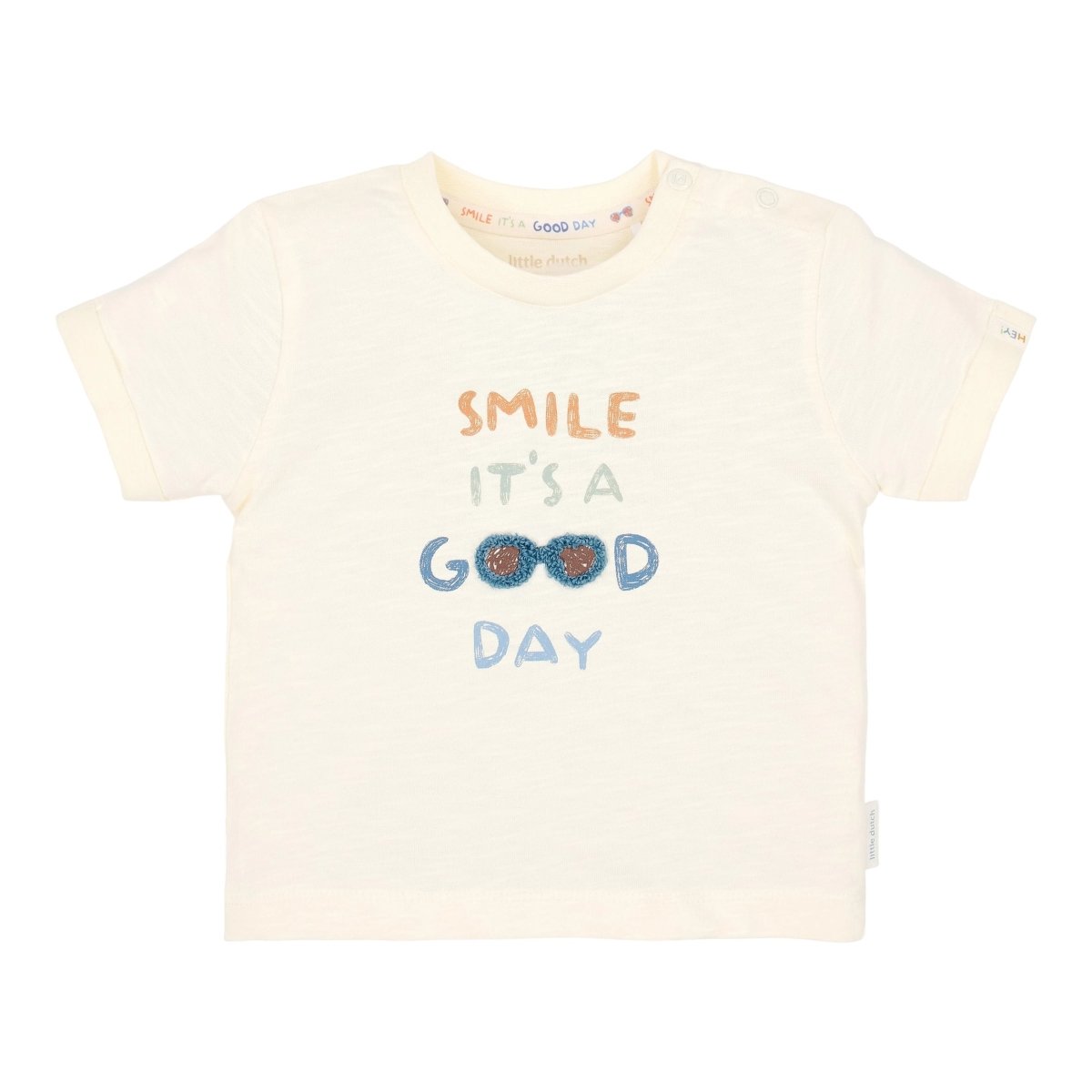 Inizia ogni giornata con un sorriso con questa morbida maglietta in un caldo color crema. La grafica giocosa sul petto con il testo "Smile, it's a good day" e un paio di occhiali da sole estivi rende la maglietta ancora più allegra. I risvolti sulle maniche aggiungono un accento fresco, mentre il morbido tessuto in 100% cotone organico, certificato Oeko-Tex, è meravigliosamente morbido e sicuro per le pelli sensibili.