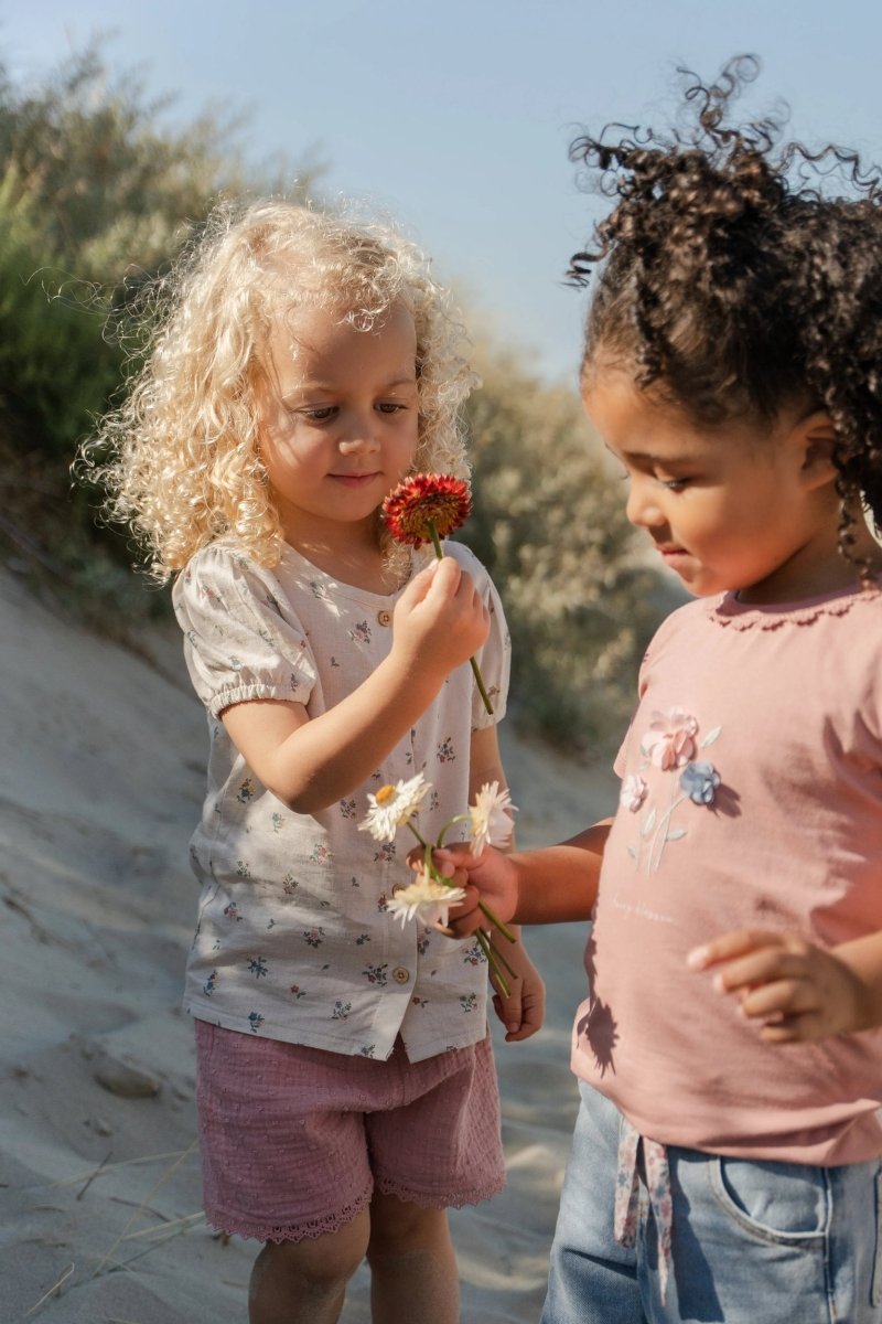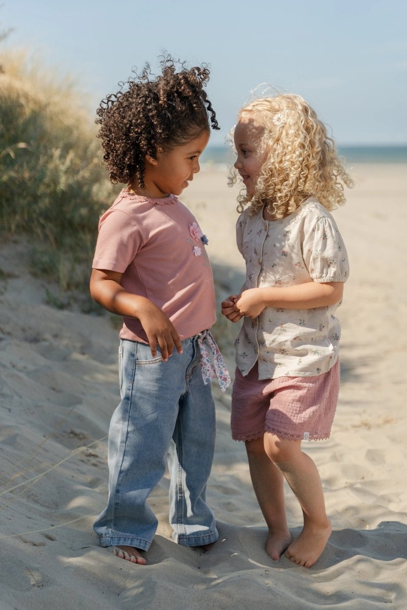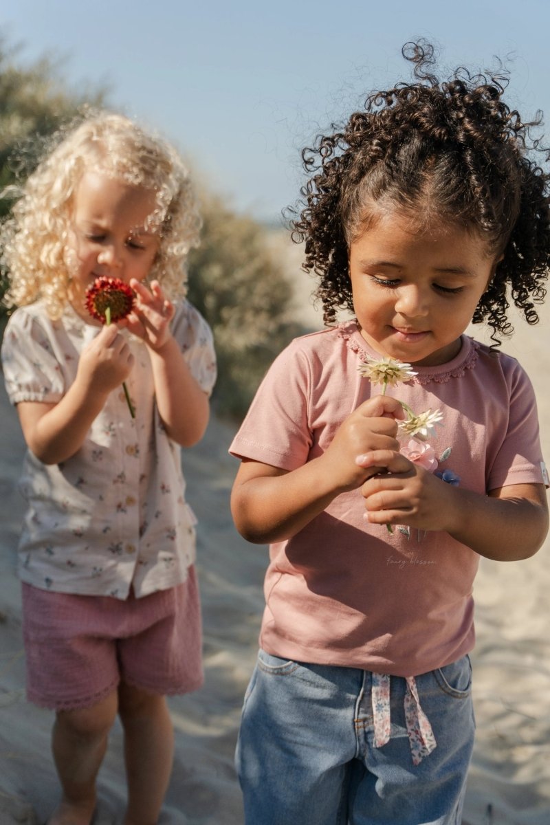 Morbida come un abbraccio e altrettanto dolce. Questa t-shirt in Pink Blush è un raffinato capo basic con un dettaglio da sogno. Un volant decorativo corre lungo la scollatura e sul petto l'opera d'arte Fairy Garden Flower sboccia delicatamente. Il tessuto è delizioso e morbido sulla pelle ed è realizzato in cotone biologico. Una maglietta allegra per i piccoli avventurieri, facile da abbinare ai loro pantaloncini o alle loro gonne preferite