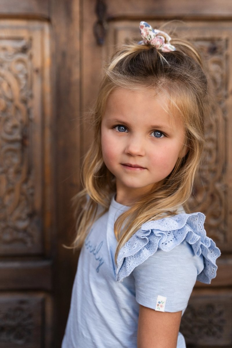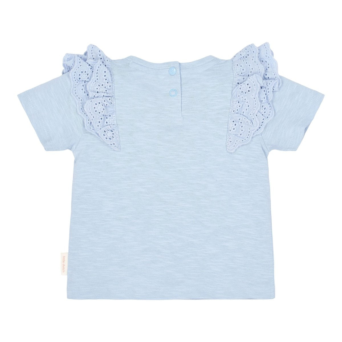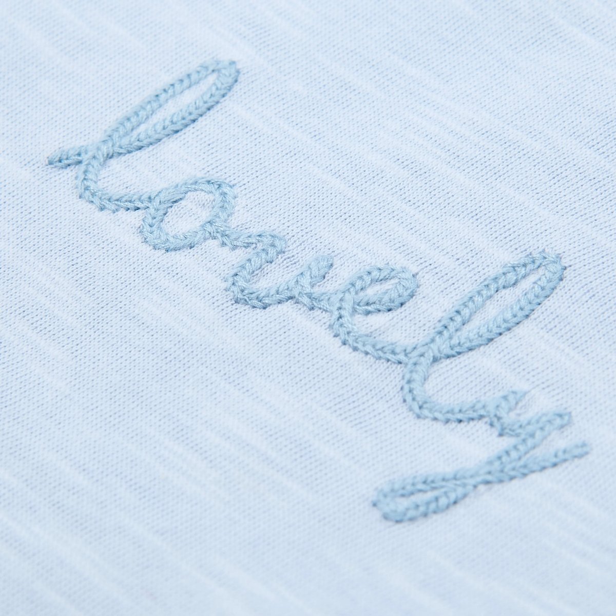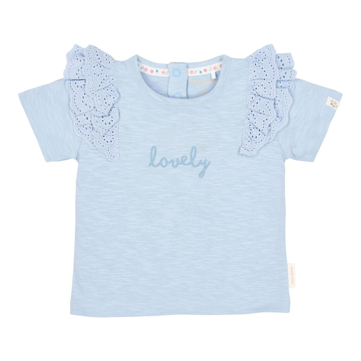 Un tocco sognante, meravigliosamente morbido e pieno d'amore. Questa maglietta azzurra è la preferita per le giornate estive. I volant in broderie sulle spalle danno alla maglietta un tocco giocoso e sofisticato, mentre l'immagine in 3D "Lovely" sul petto trasmette un messaggio d'amore.