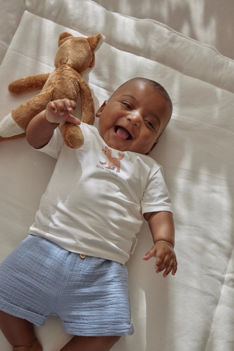 Morbida, semplice e piena di fascino. Questa maglietta a maniche corte in bianco neve è un capo basic raffinato con un dettaglio giocoso. La dolce stampa Forest Friends sul petto strappa un sorriso ogni volta. Grazie ai pratici bottoni a pressione sulla spalla, vestirsi e svestirsi è un gioco da ragazzi.